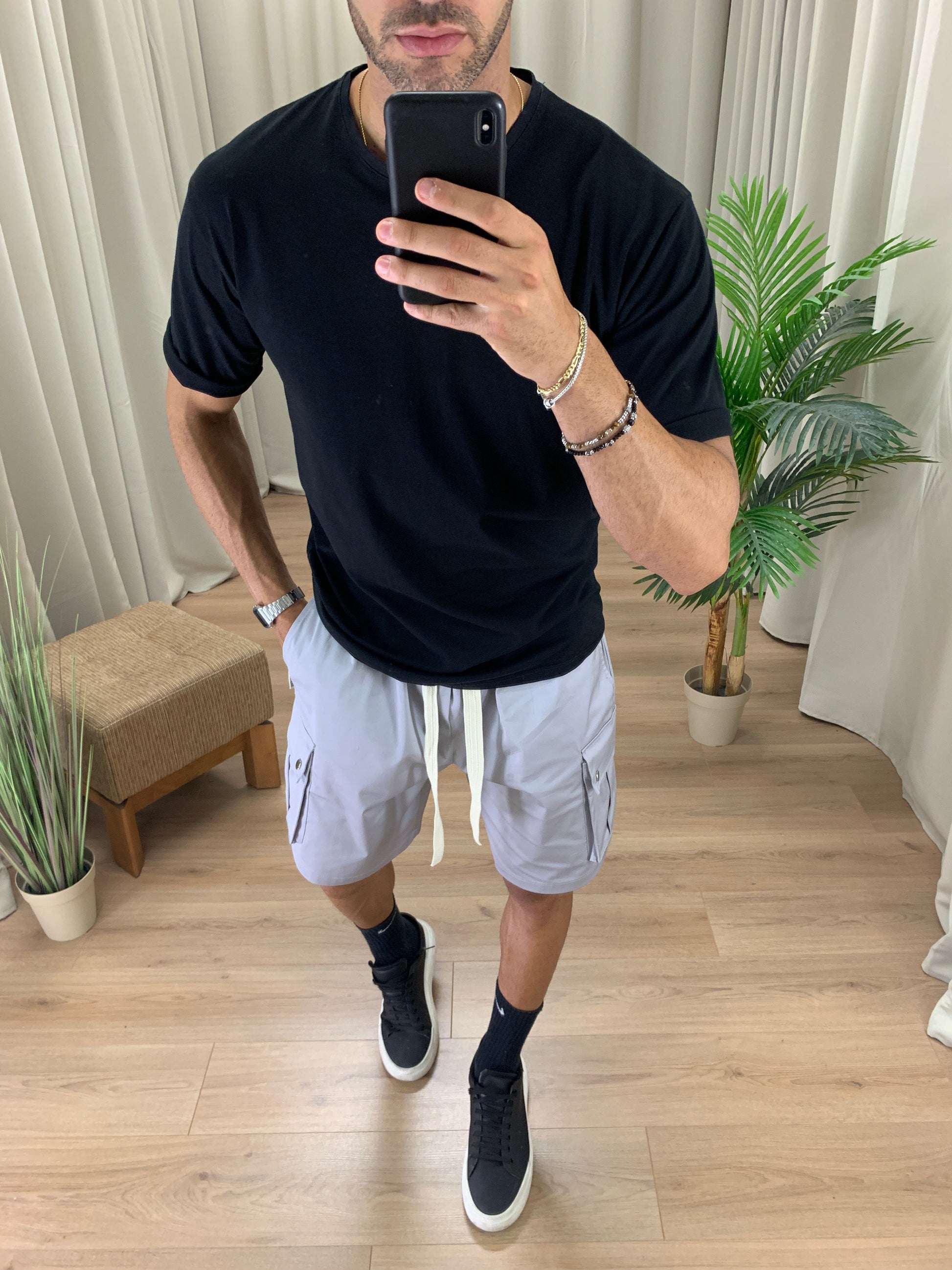 Il modello è alto 189 cm e pesa 89 Kg. Indossa la taglia XL