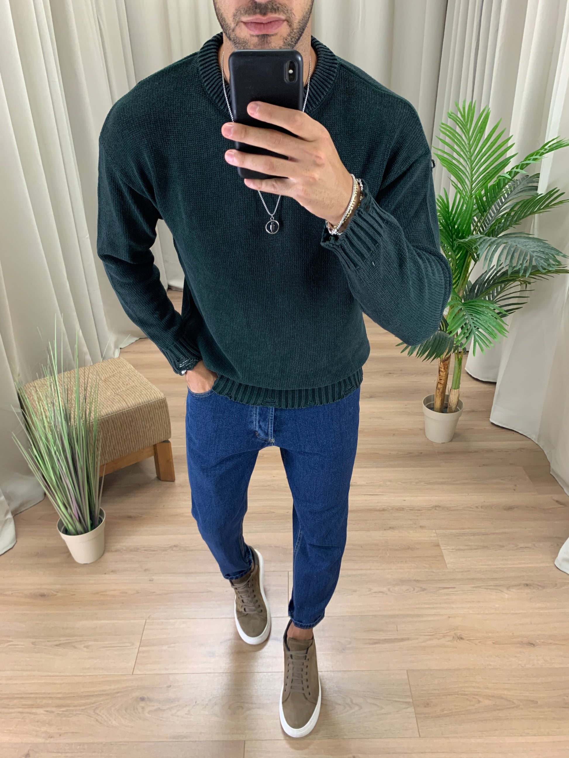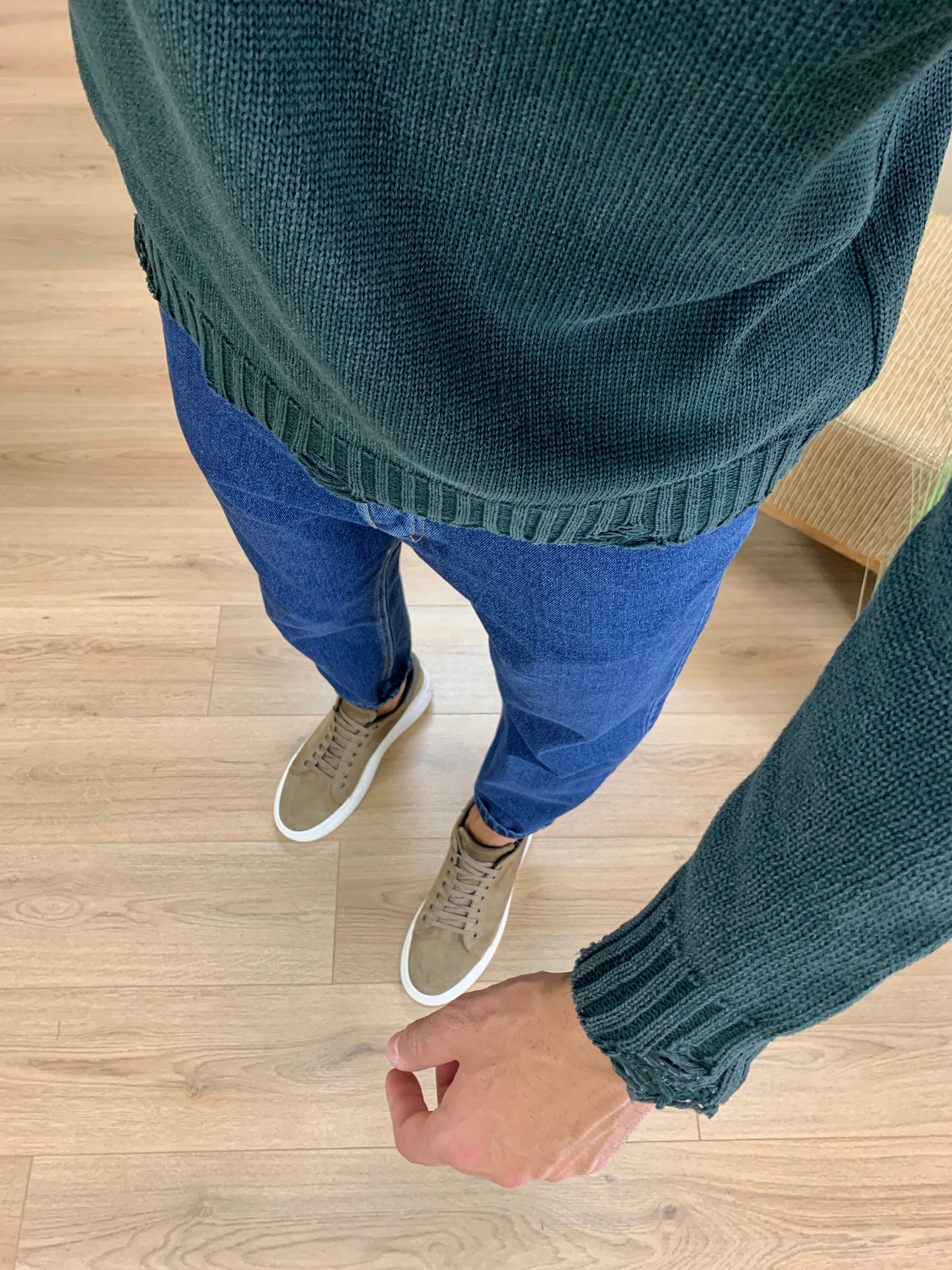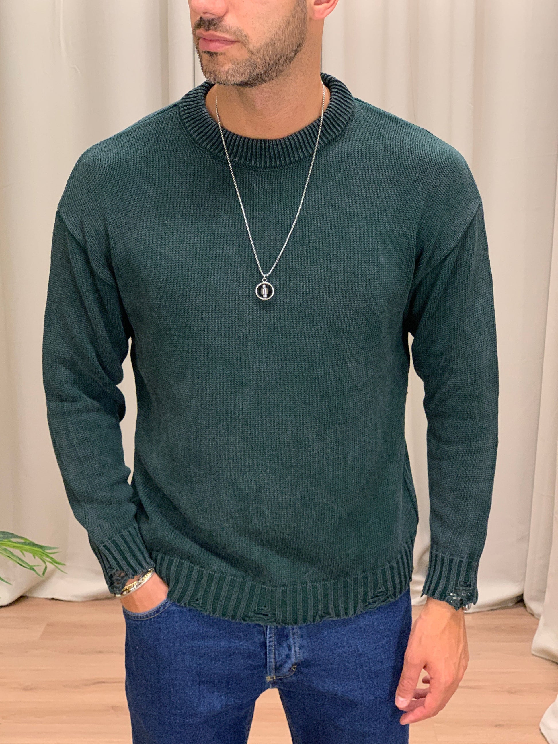 Maglioncino Slavato con Fondo Sfrangiato col. Verde Bosco