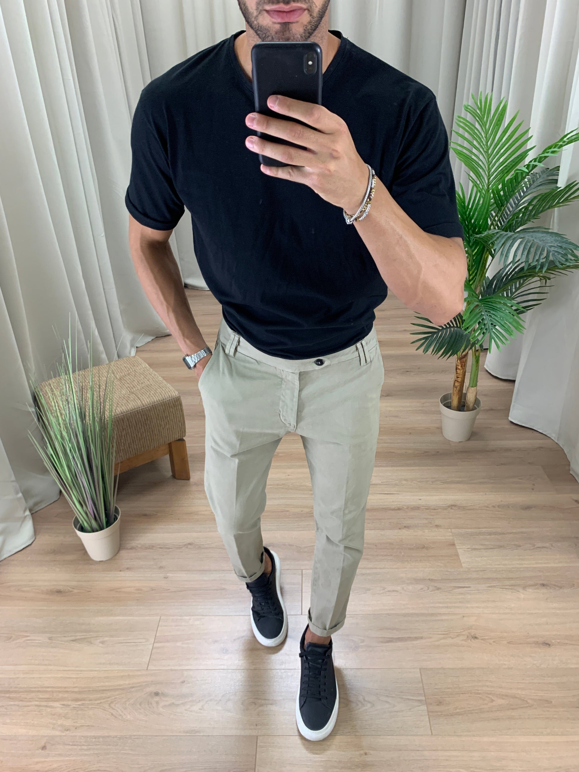 Pantalone con piega centrale, rimane slim al polpaccio e corto alla caviglia