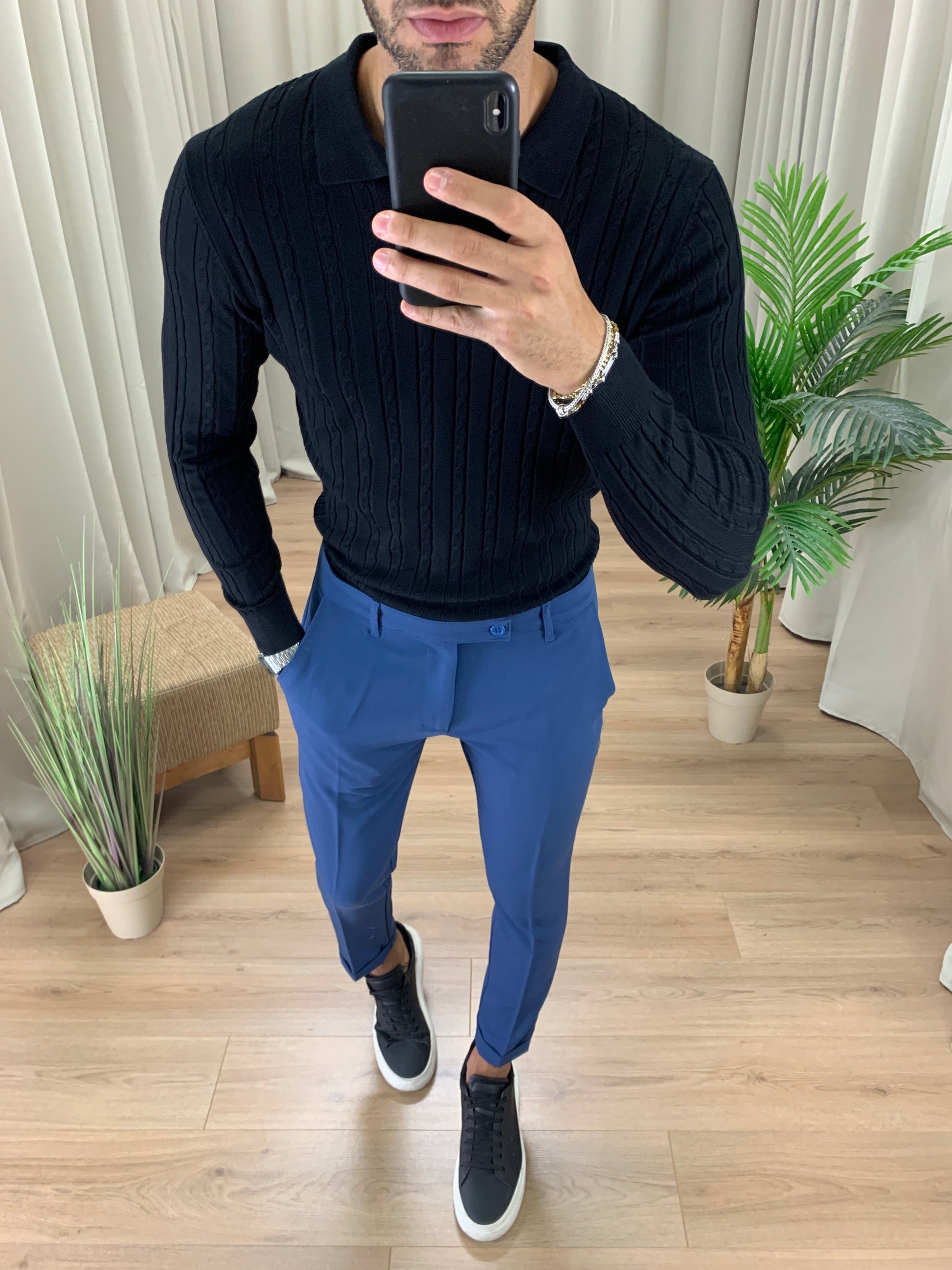 Pantalone con piega centrale, rimane slim al polpaccio e corto alla caviglia con risvolto cucito