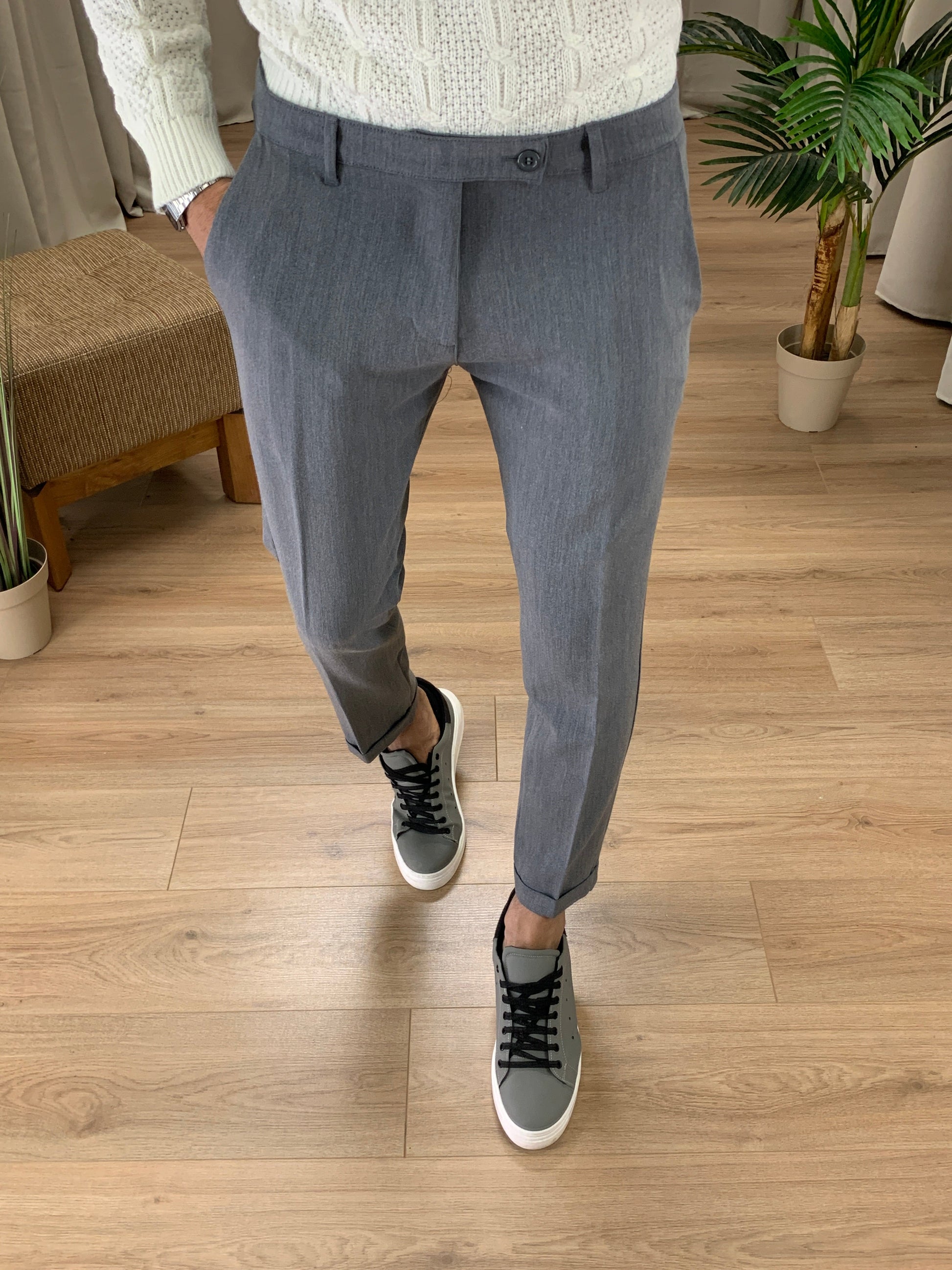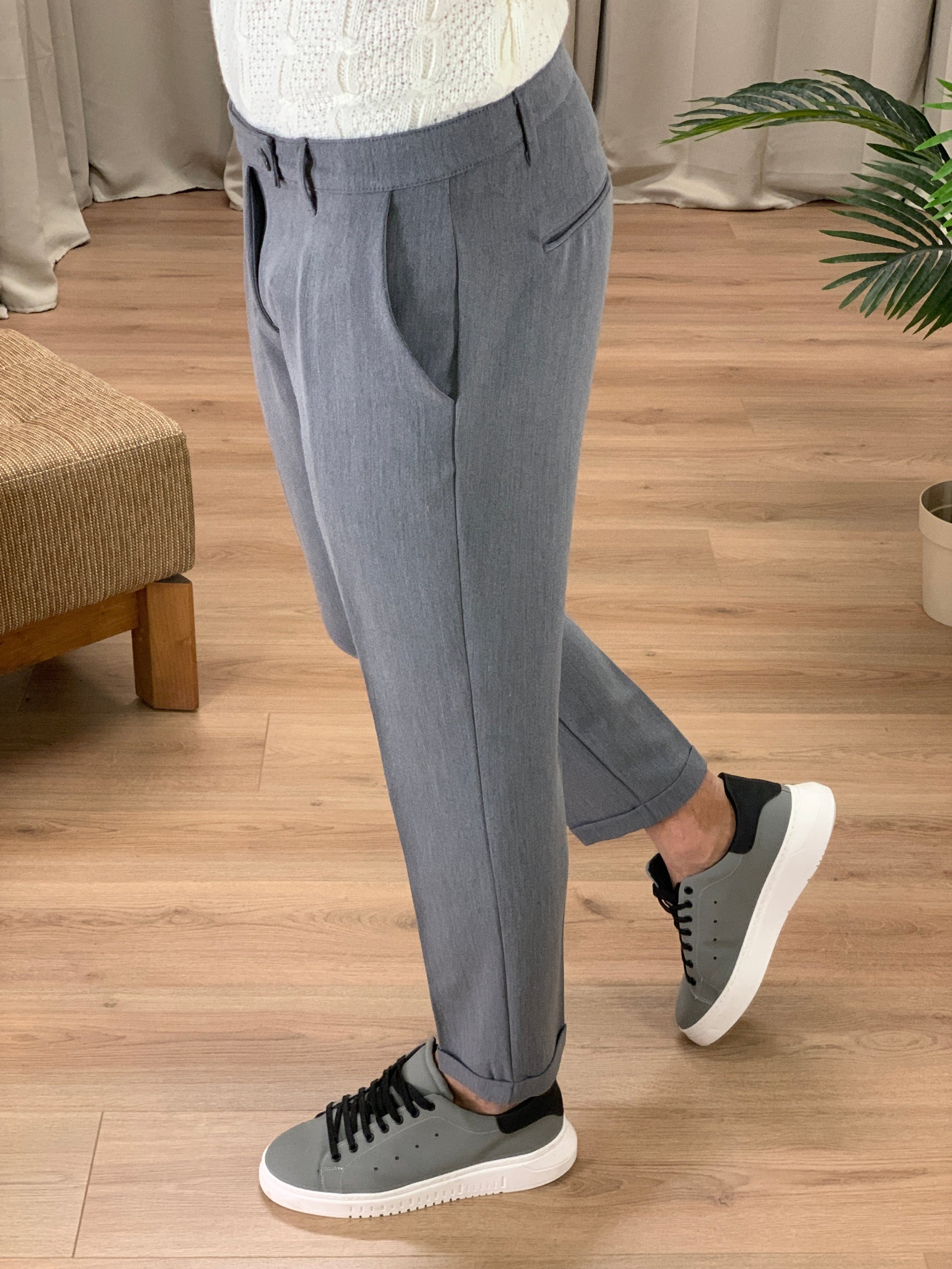 Pantalone con piega centrale, rimane slim al polpaccio e corto alla caviglia con risvolto cucito
